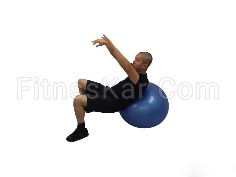 ٤_ سپس به کمک شکمتان خودتان را بلند کنید و دستانتان به جلو دراز کنید و همزمان توپ طبی را نیز تا جایی که میتوانید به جلو پرتاب کنید.